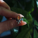 A polished piece of Citrine on a hammered sterling silver ring band. Silver dots under the wishbone representing rays of the sun.