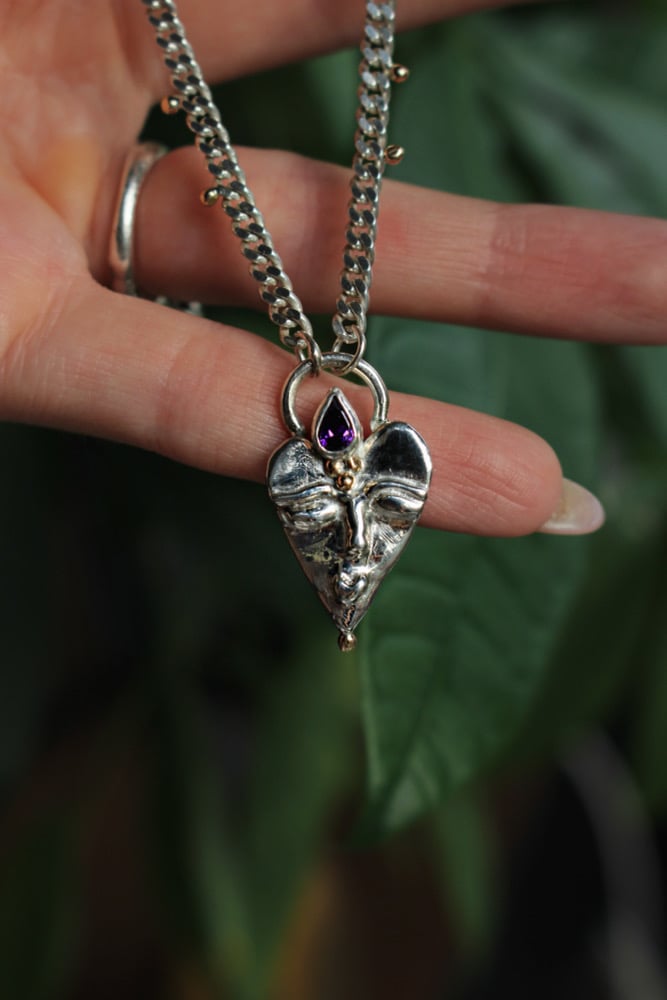 A solid heavy, hand carved face on a freehand shaped heart. A face that looks mysterious yet friendly, deep eyes and prominent lips. A dark Amethyst tear drop as a crown, decorated with 9ct gold fill dots.