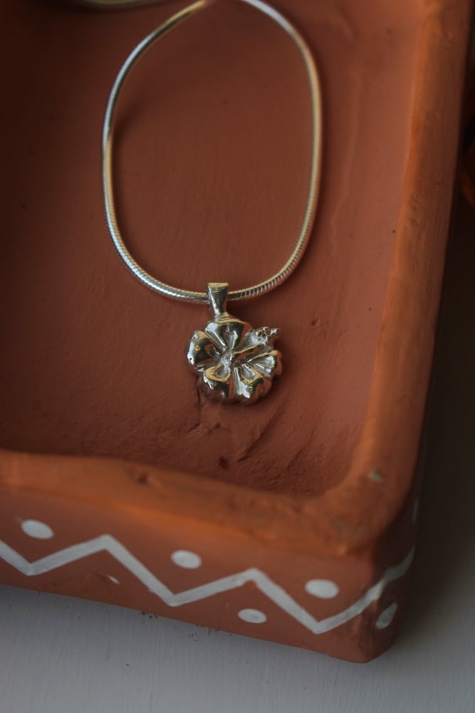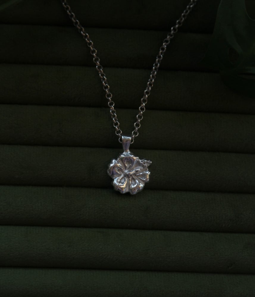 A hand carved solid sterling silver hibiscus flower. Hanging on a thick solid 18” sterling silver snake chain.