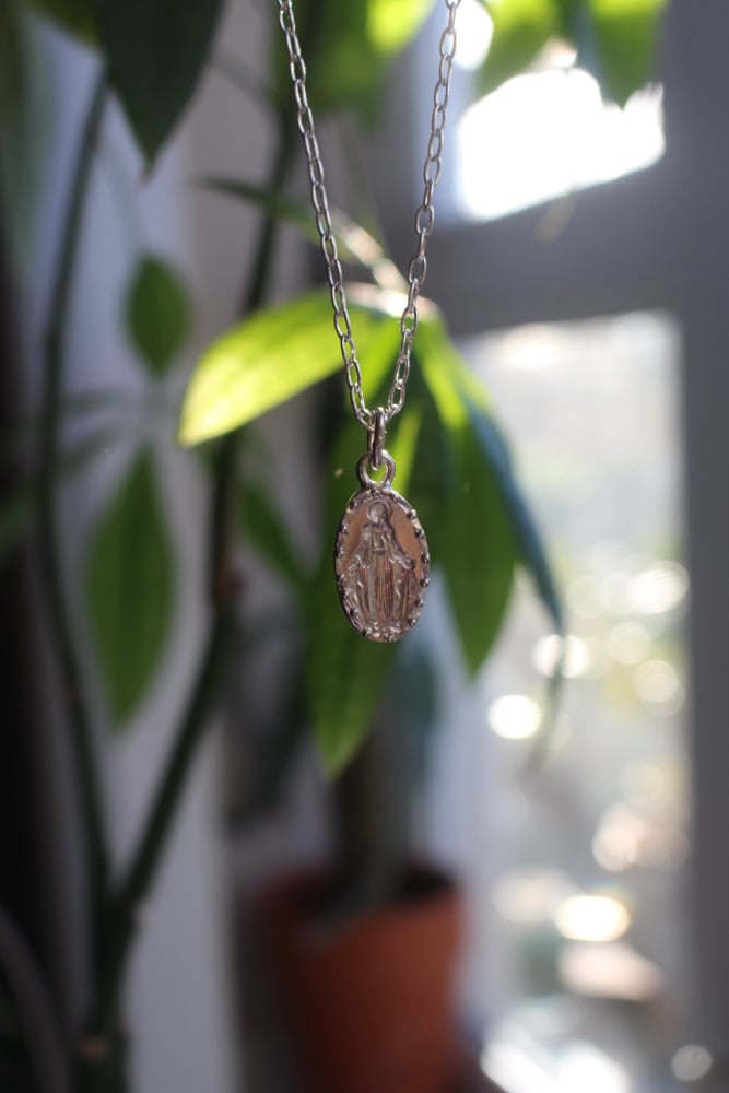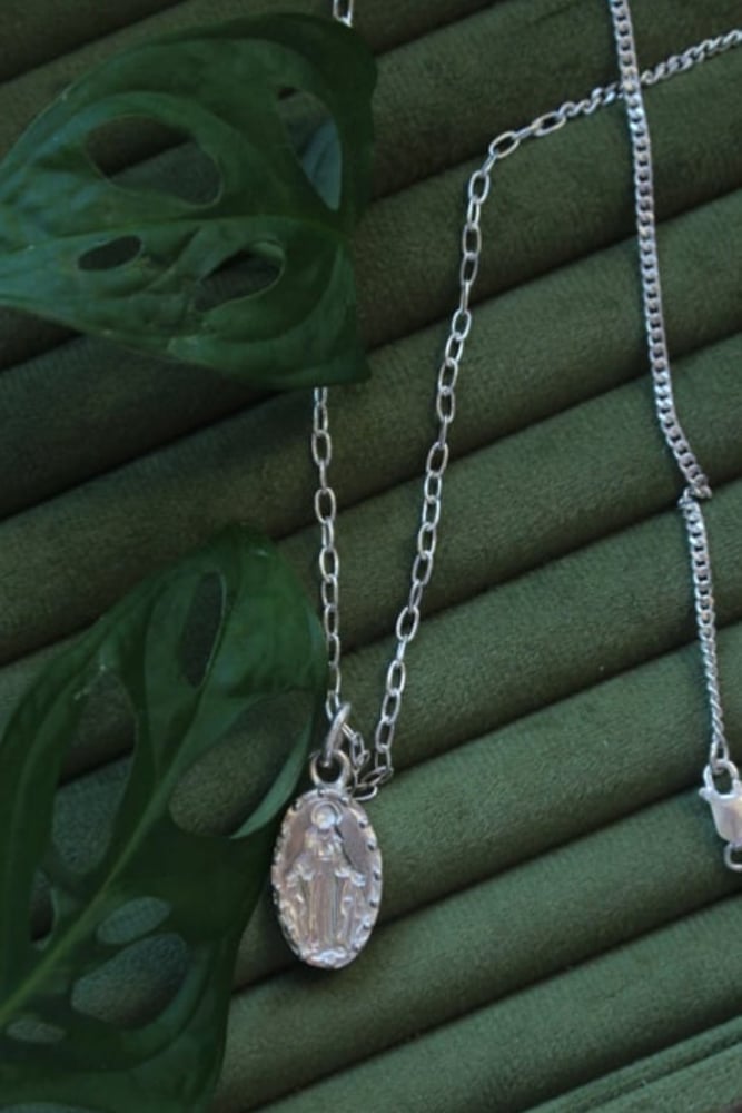 A hand carved Mother Mary talisman. Surrounded by shimmering silver dots on a sterling silver chain. All sterling silver.