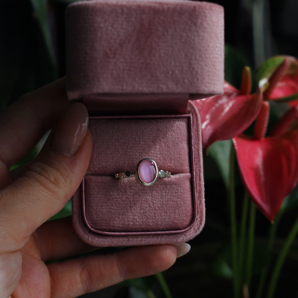A beautiful soft pink Mother of Pearl. Sits on a sterling silver ring band, decorated with silver each side. Representing the moon and its phases.