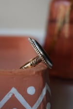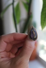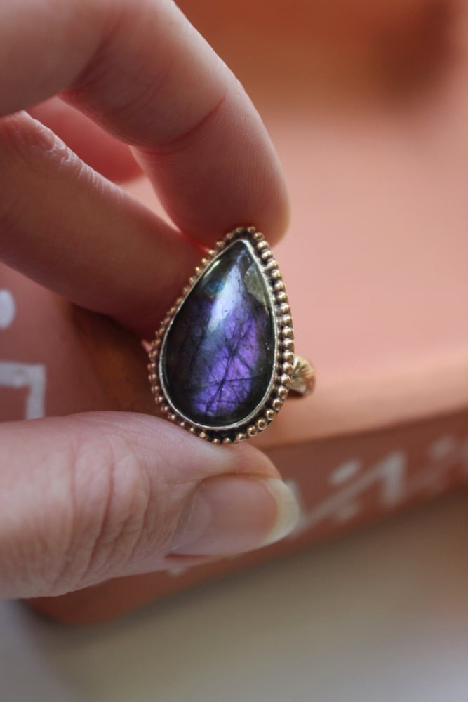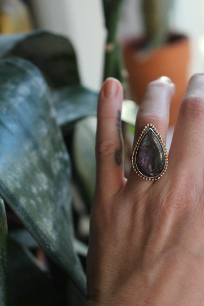 A stunning rare piece of Purple Labradorite. Encased in sterling silver but surrounded by 9ct gold filled beads. It sits ontop of a one of a kind 9ct gold filled floral ring band.