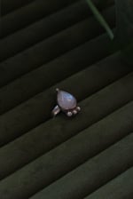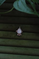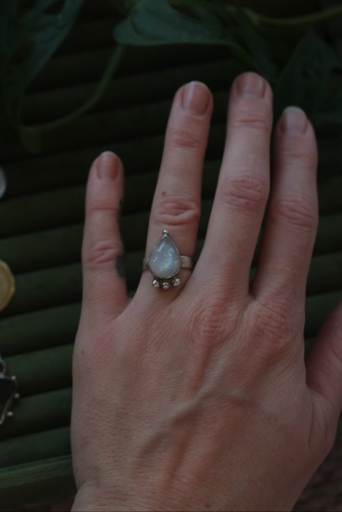 A small but mighty teardrop shape of Rainbow Moonstone. These pictures don’t do the true flashes of colour in this stone any justice. Surrounded by shimmering sterling silver ball accents.
