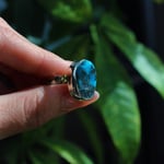 A raw piece of Morenci Turquoise with Pyrite. A truly gorgeous one of a kind stone. Sits on a hammered sterling silver ring band, decorated by brass dots to compliment the flecks of golden Pyrite.